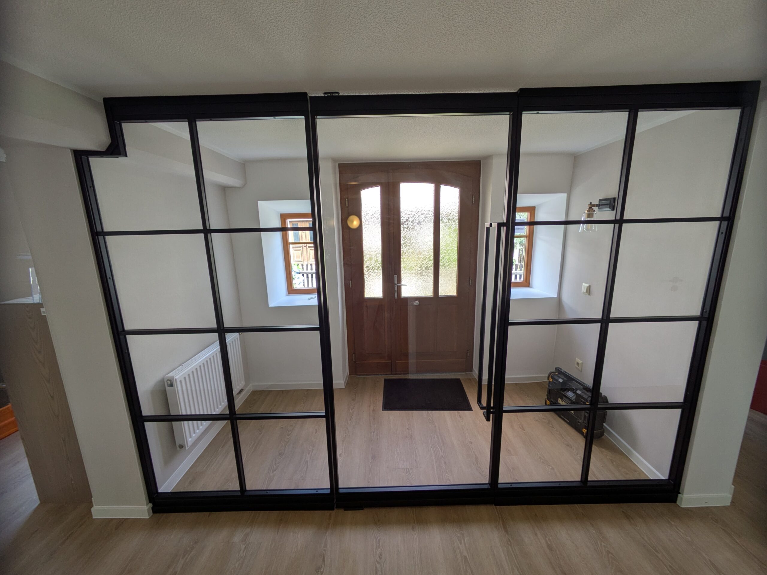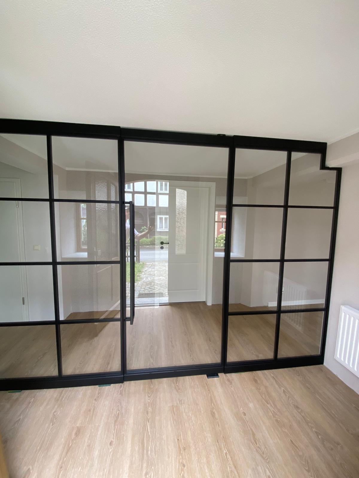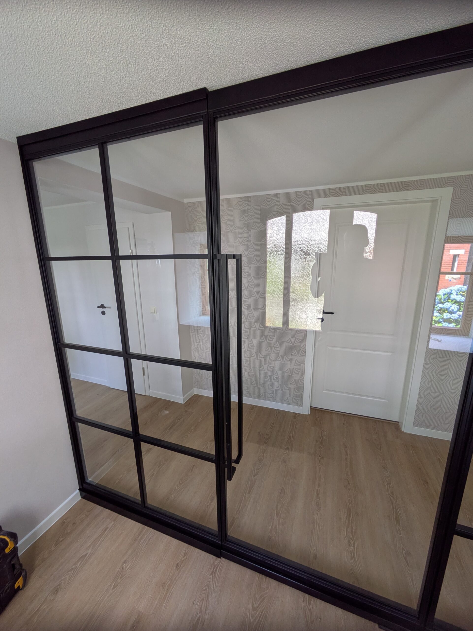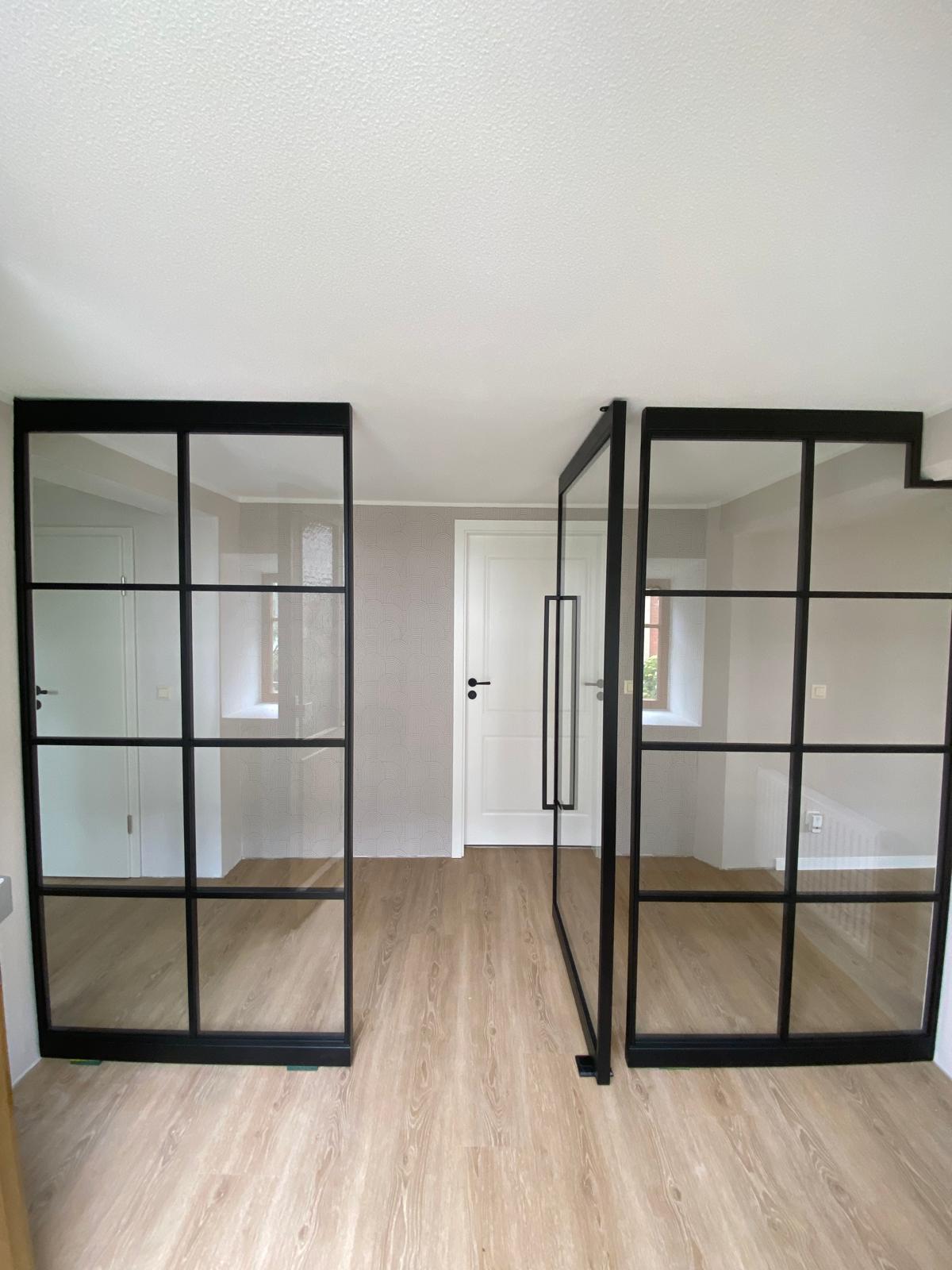 Für dieses Projekt wurden hochwertige Innentürelemente im Landhausstil aus massivem Holz gefertigt, jeweils mit zwei Füllungen, die den Türen eine elegante und zeitlose Optik verleihen. Ergänzend dazu realisierte die Tischlerei Apelt eine maßgeschneiderte Lofttüranlage in Erkelenz. Diese besteht aus zwei Seitenteilen, einer individuell nach Kundenwunsch gestalteten Sprossenteilung und einer funktionalen Pendeltür. Alle Elemente verbinden hohe handwerkliche Qualität mit ansprechendem Design und fügen sich harmonisch in das Raumkonzept ein.