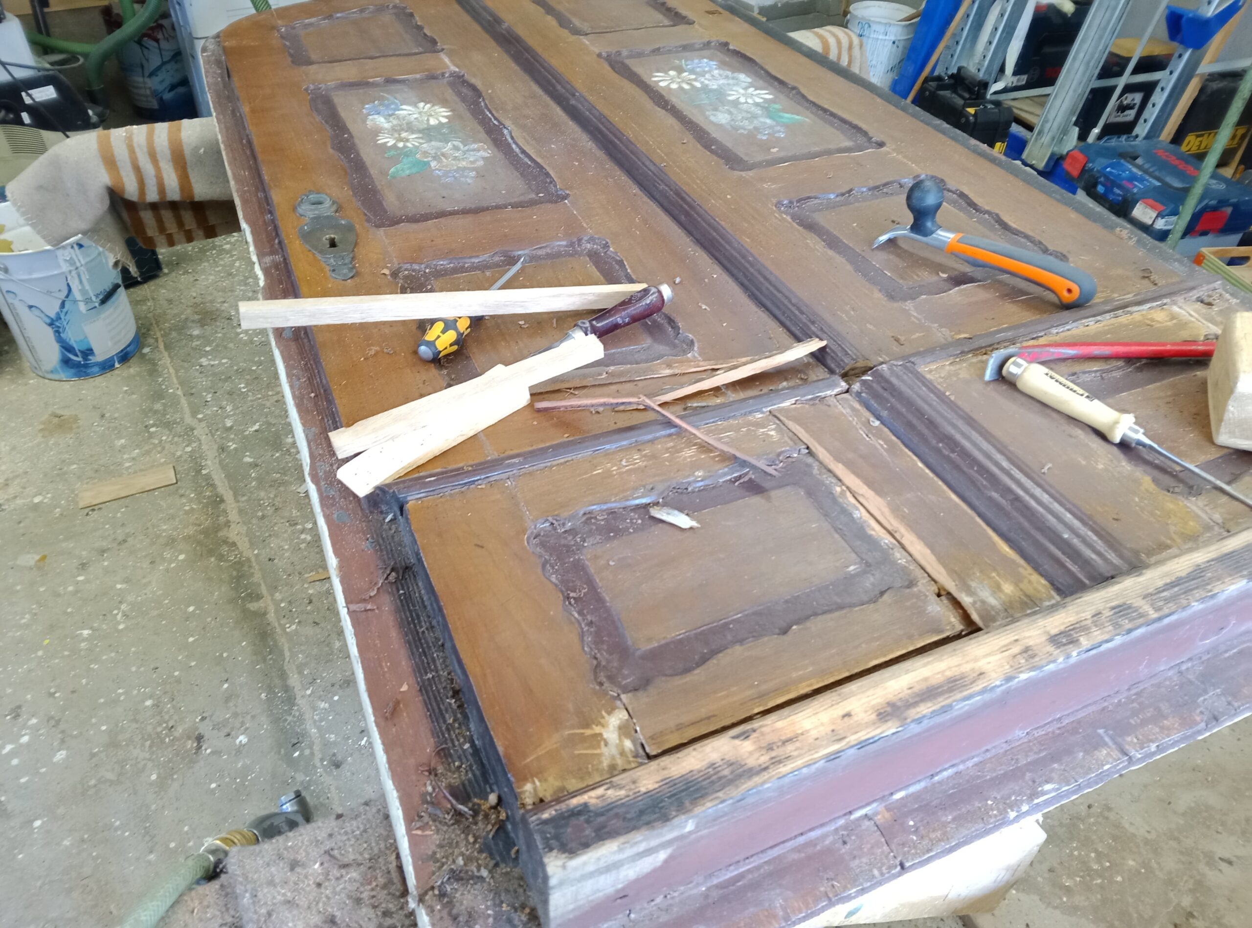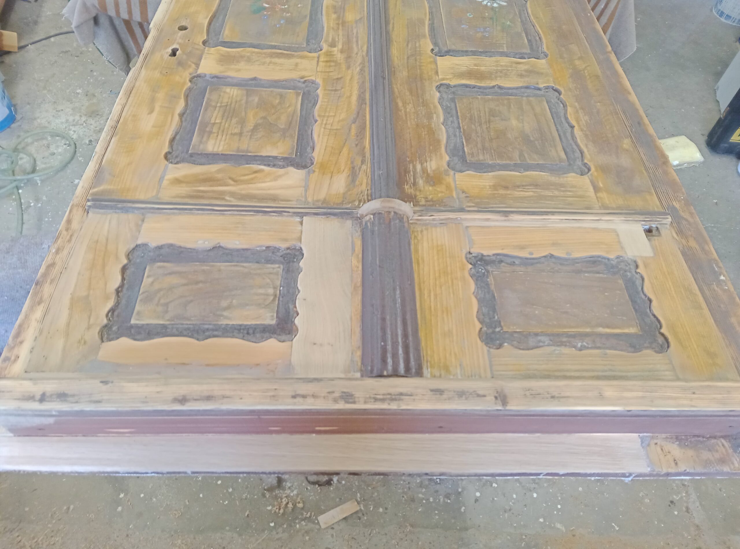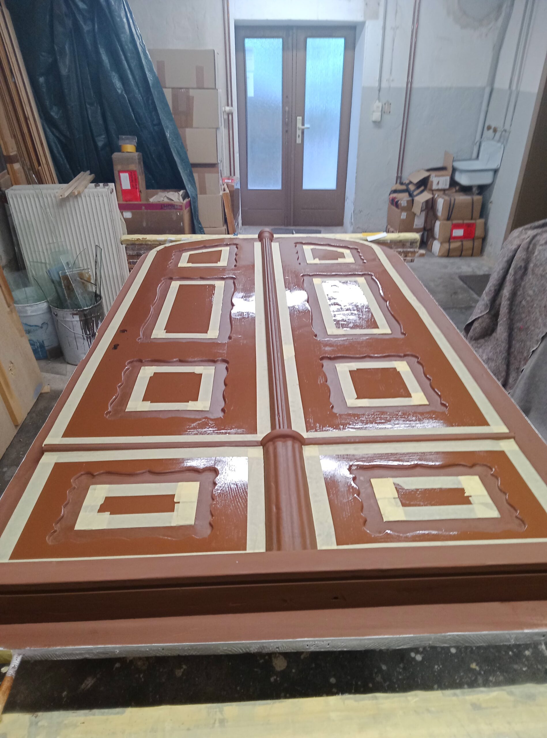 Beschädigte Bereiche der Tür wurden gezielt instand gesetzt. Dazu gehörte der Ersatz des unteren Kapitells, das Erneuern einzelner Teile der Friese sowie das Aussetzen von Rissen und Fehlstellen. Alle Arbeiten erfolgten mit größter Sorgfalt und passend zum bestehenden Bauteil.