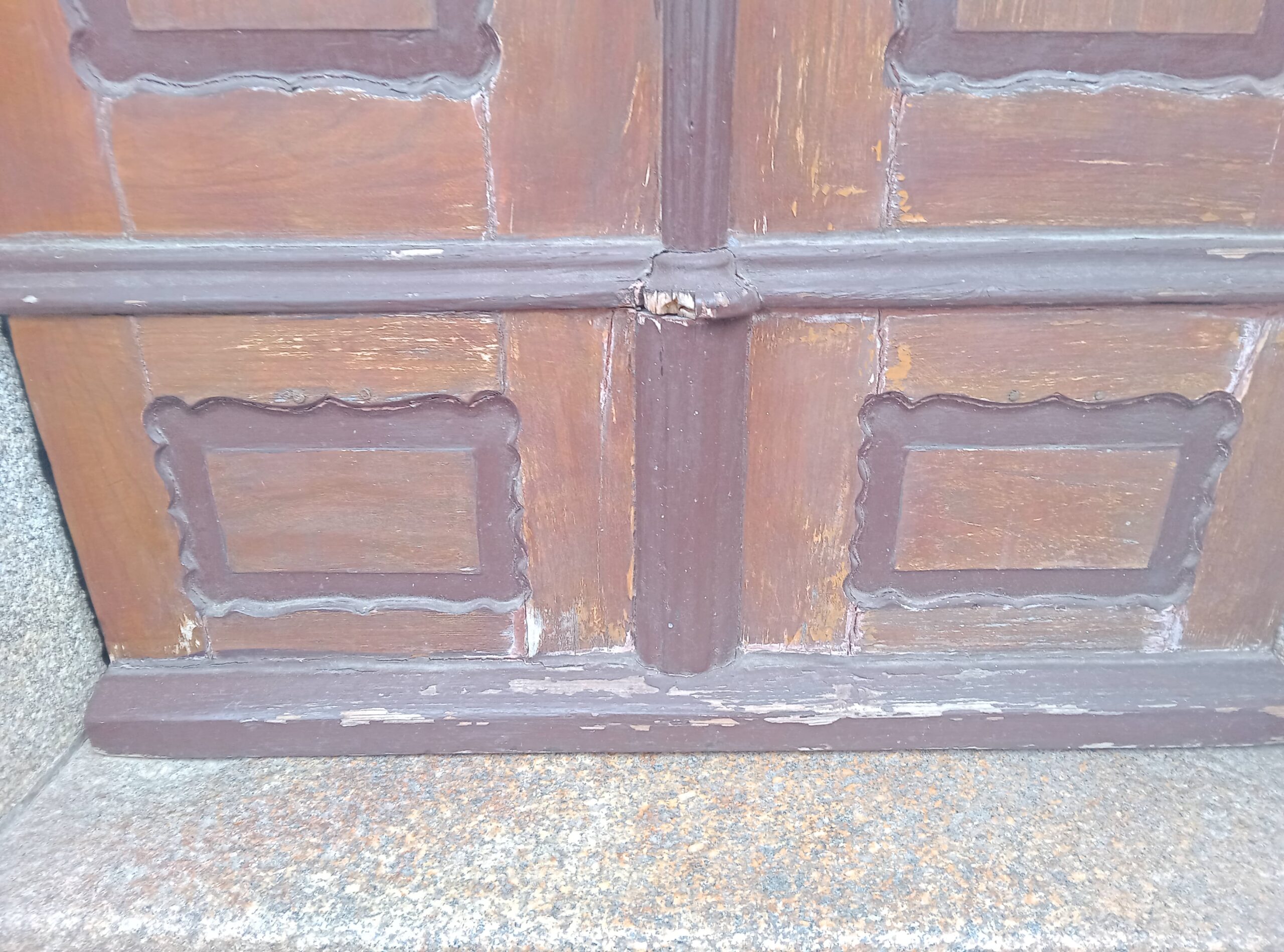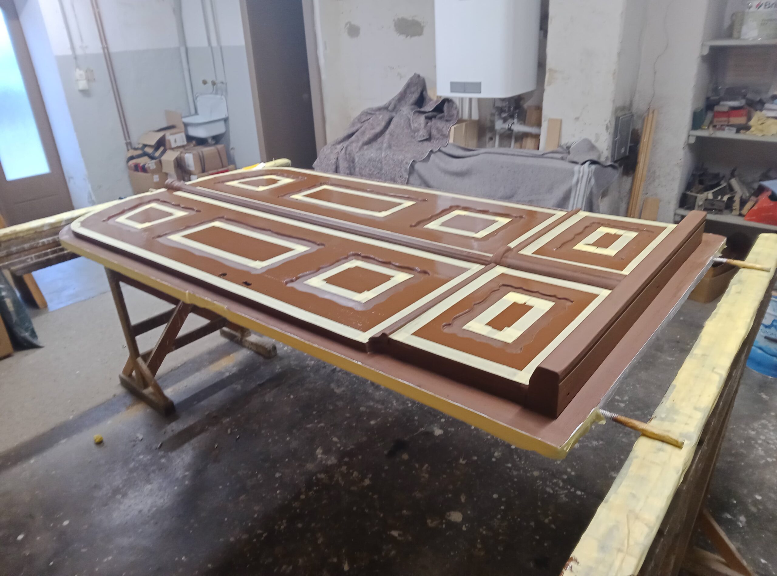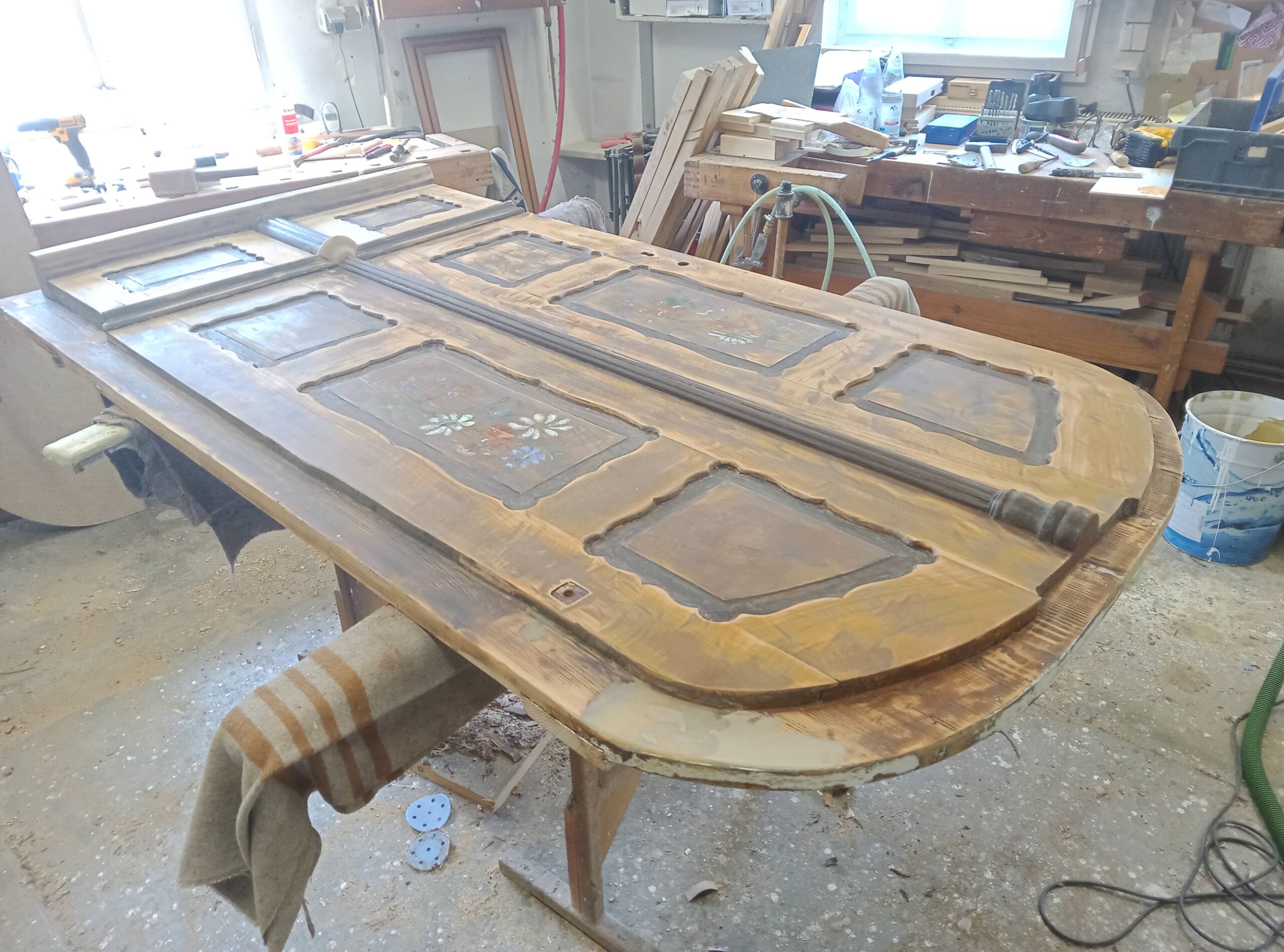 Beschädigte Bereiche der Tür wurden gezielt instand gesetzt. Dazu gehörte der Ersatz des unteren Kapitells, das Erneuern einzelner Teile der Friese sowie das Aussetzen von Rissen und Fehlstellen. Alle Arbeiten erfolgten mit größter Sorgfalt und passend zum bestehenden Bauteil.