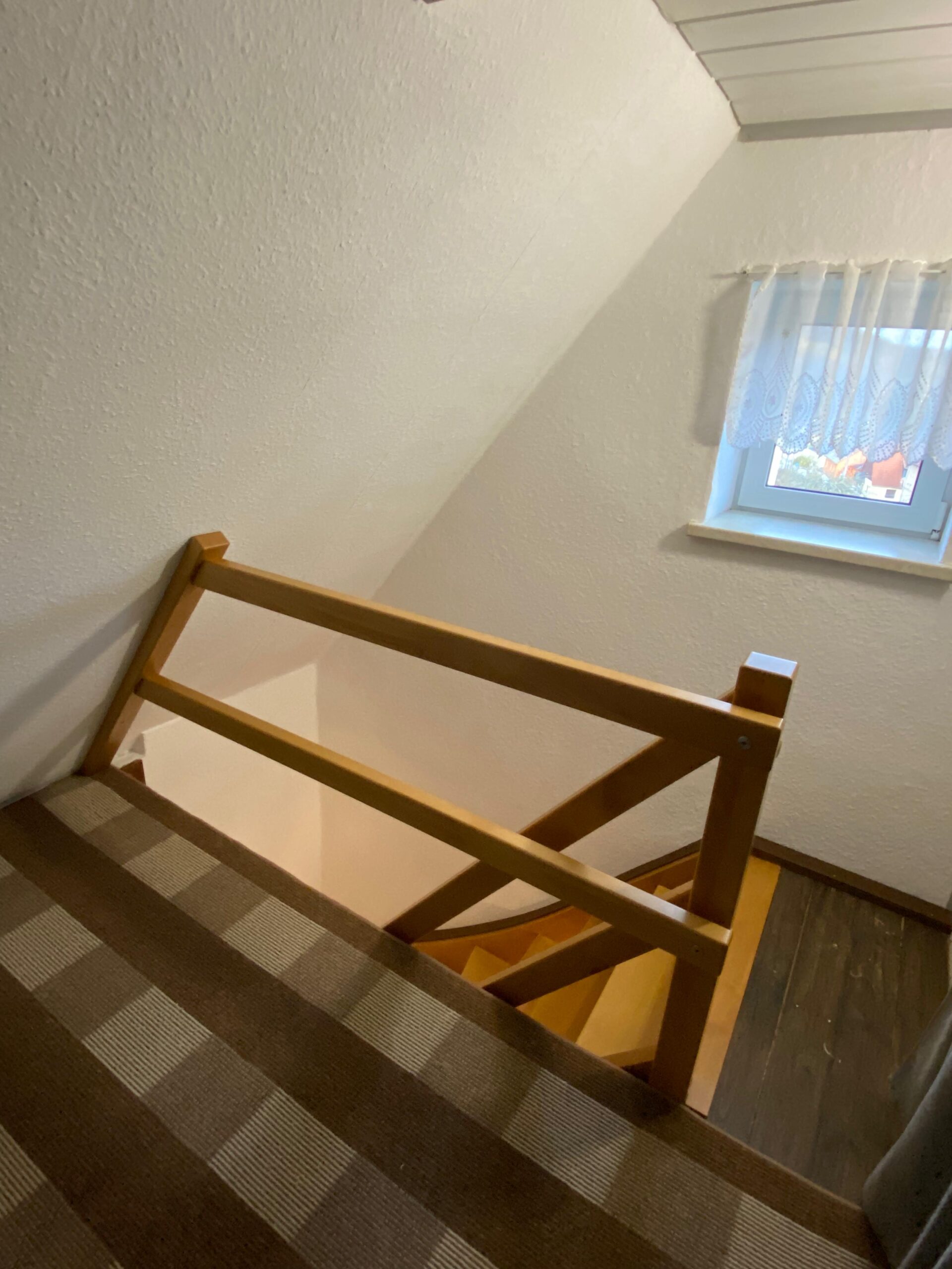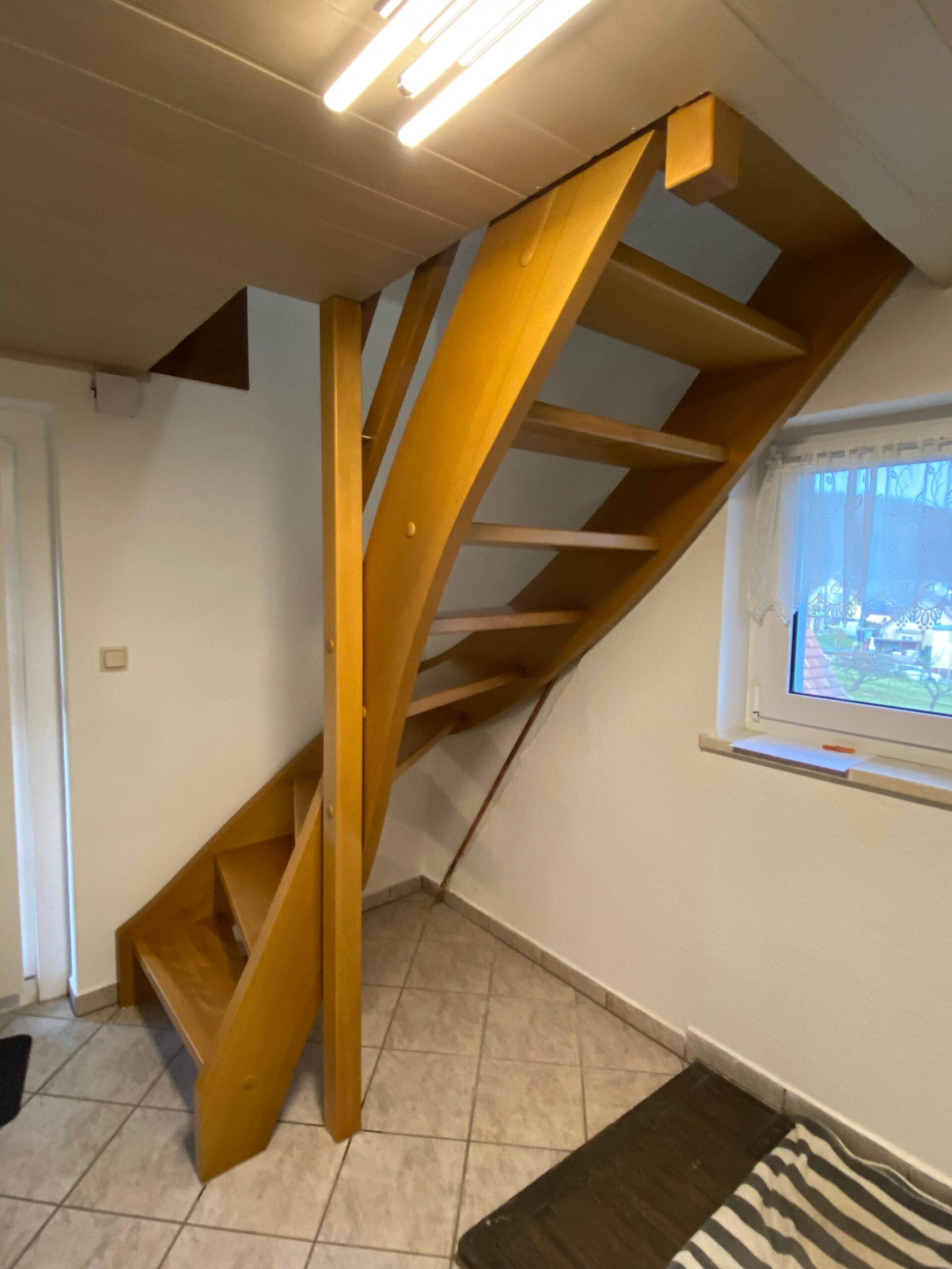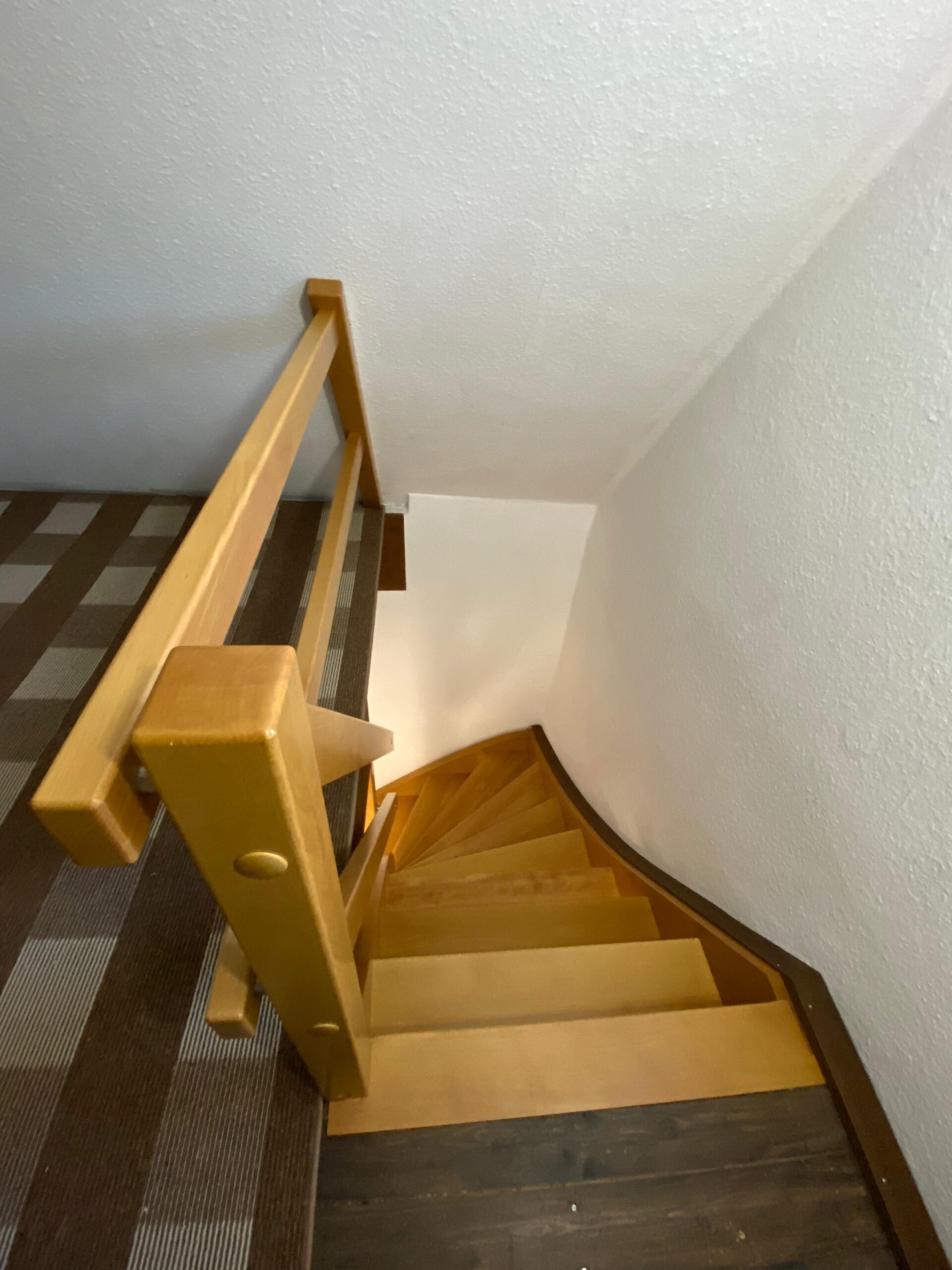 Die Treppe wurde in gestemmter Ausführung hergestellt – eine klassische handwerkliche Bauweise, die für Stabilität, Langlebigkeit und eine hochwertige Anmutung steht. Die viertelgewendelte Konstruktion fügt sich harmonisch in den vorhandenen Grundriss ein und ermöglicht eine platzsparende, zugleich komfortable Erschließung der Geschosse.